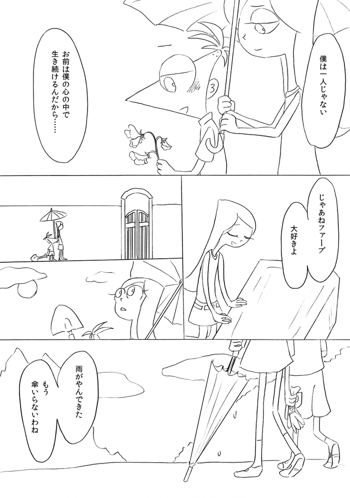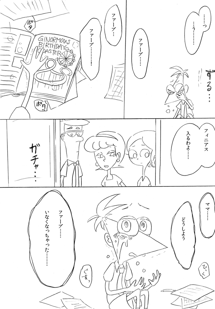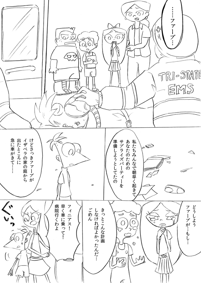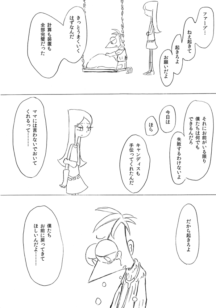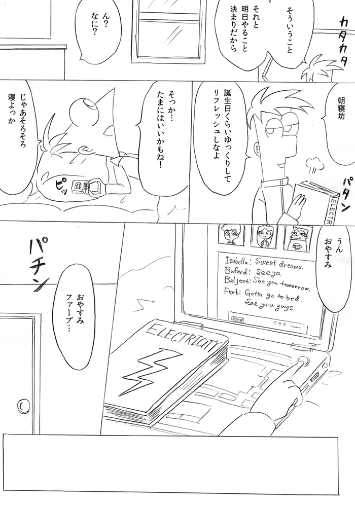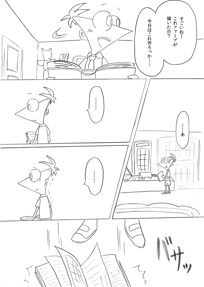 (最終ページ後、フィニアスが目を覚ますとファーブも生きていて予定通り皆で誕生日パーティーをして終了)